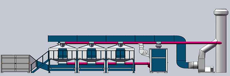 擬處理的印刷廢氣考慮運營成本及安全(quán)性,本方案工藝路線擬采用以“通風係統(風機、收集(jí)罩、管道)+預處理係統(過濾(lǜ)器)+深度淨化係統(吸附脫附+催化燃燒)”為核心工藝(yì)來處理該廢氣,工藝設(shè)備圖如下: