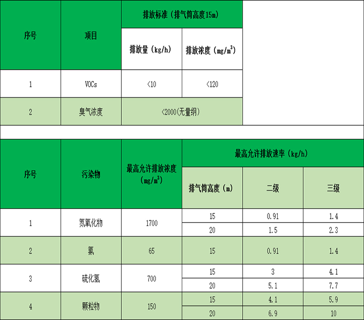 廢氣排放標(biāo)準(zhǔn)執行(háng)《大氣汙染物綜合排放(fàng)標準》(GB16297-1996)、《惡臭物質排放標準》(GB14554-93)二級標準,排放標(biāo)準如下(xià):